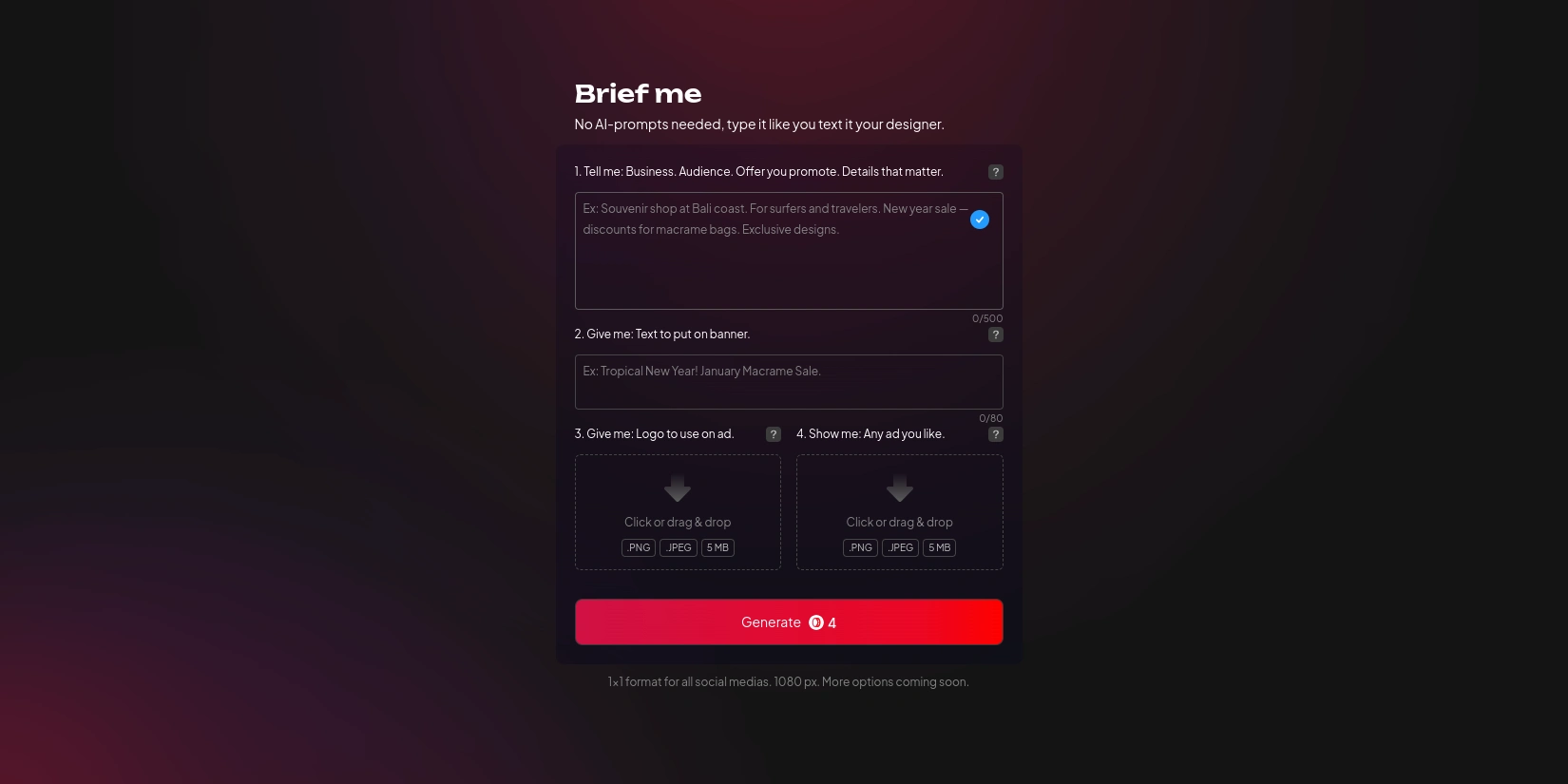 - Простота использования. При вводе инструкции можно забыть о строгих правилах. Пользователям предлагается просто написать, что они хотят видеть на баннере, как при общении с дизайнером через мессенджер. Желательно указать сферу бизнеса, целевую аудиторию и добавить логотип компании.