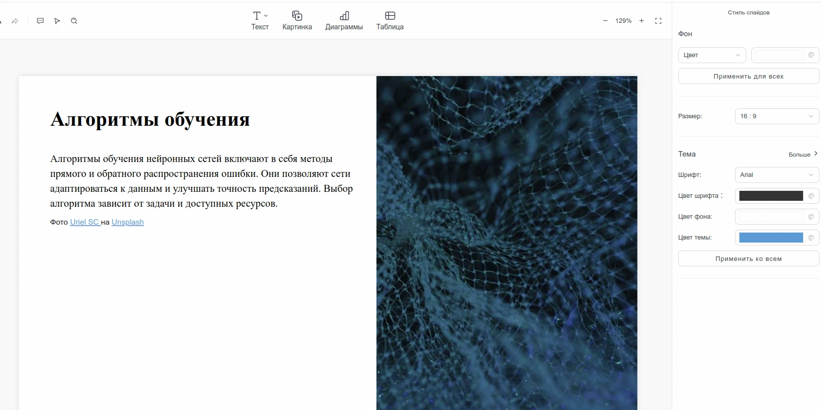 Процесс генерации происходит в несколько этапов: сначала ИИ анализирует тему и определяет ключевые аспекты, затем формирует структуру презентации, подбирает релевантные изображения и создает текстовое наполнение для каждого слайда. Особенно впечатляет способность системы автоматически добавлять диаграммы, таблицы и инфографику там, где это уместно.