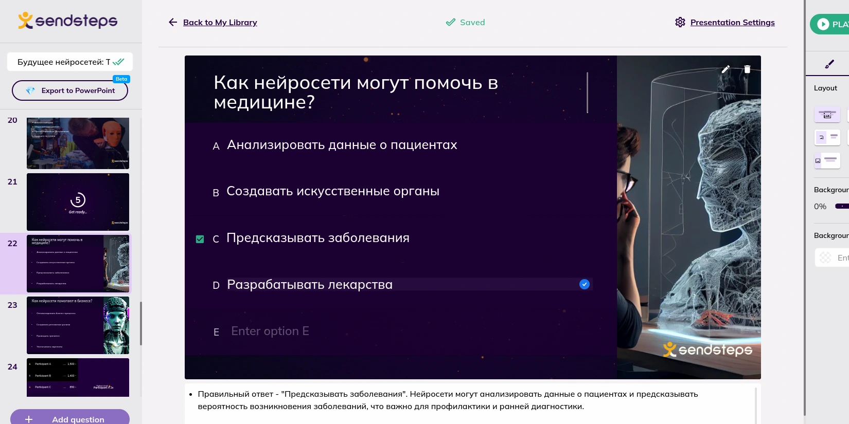 - Экспорт в формате .pptx для дальнешего редактирования;