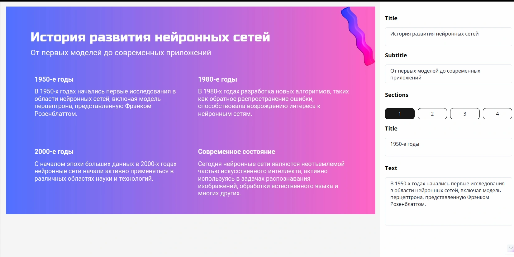 - Возможность нейросети создавать презентации на русском языке бесплатно;